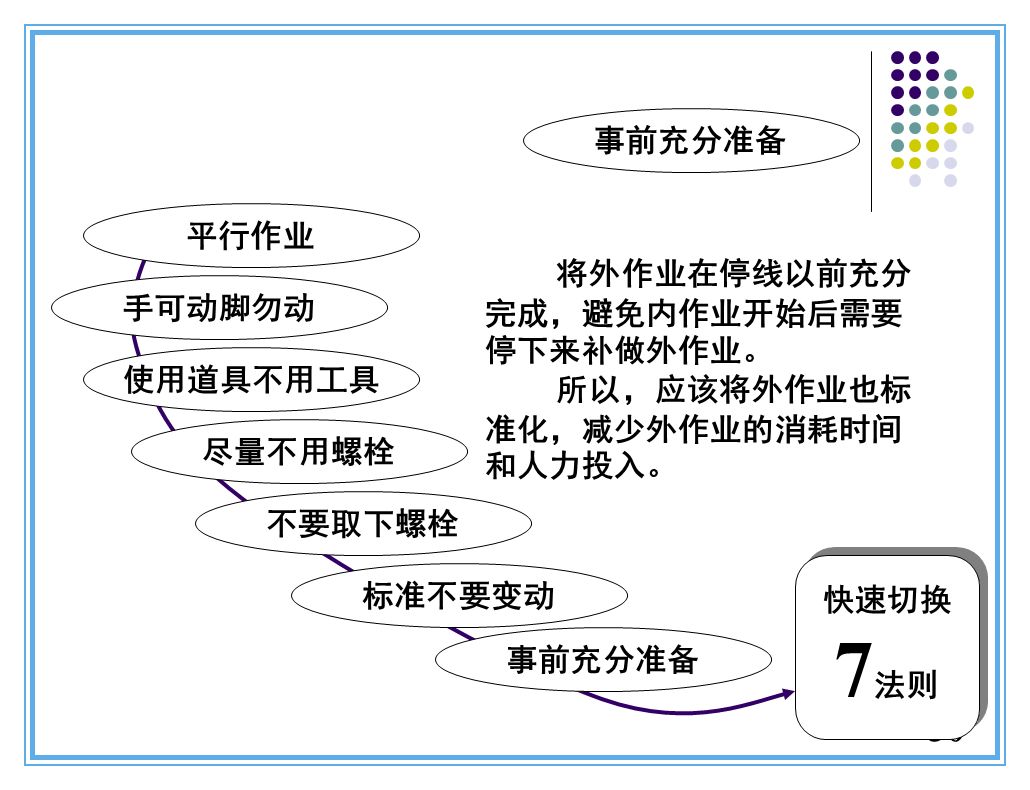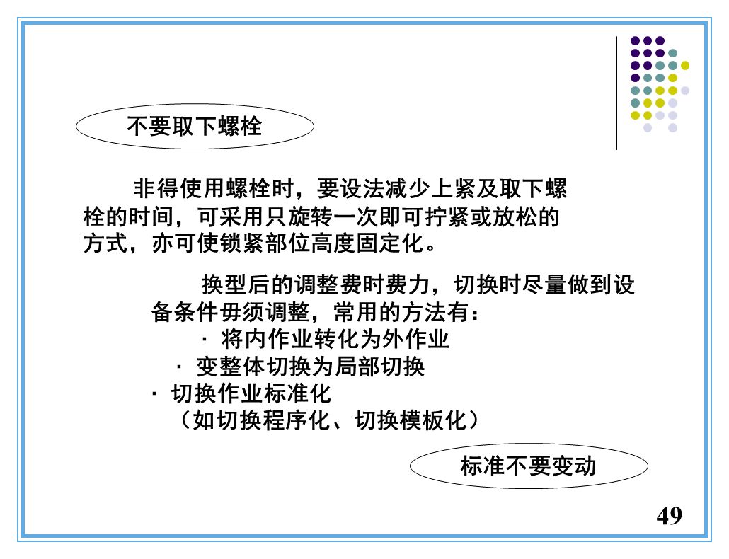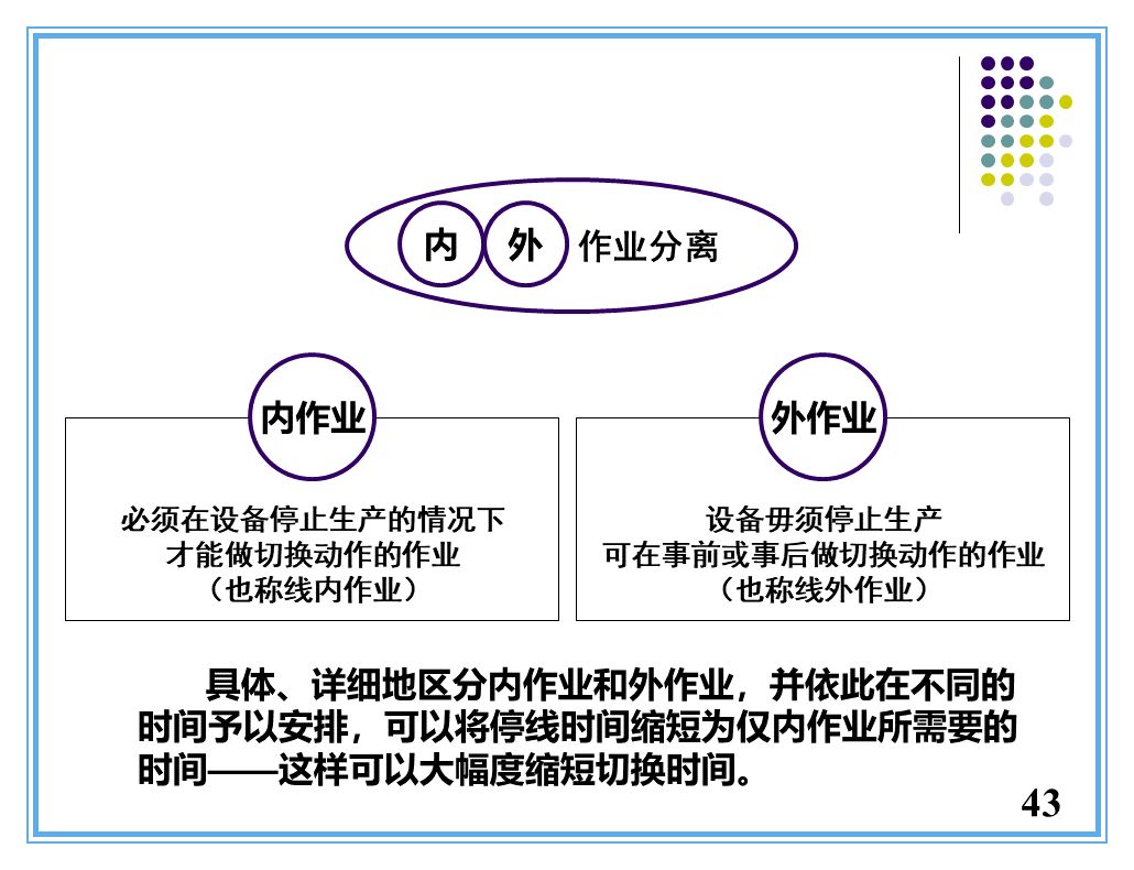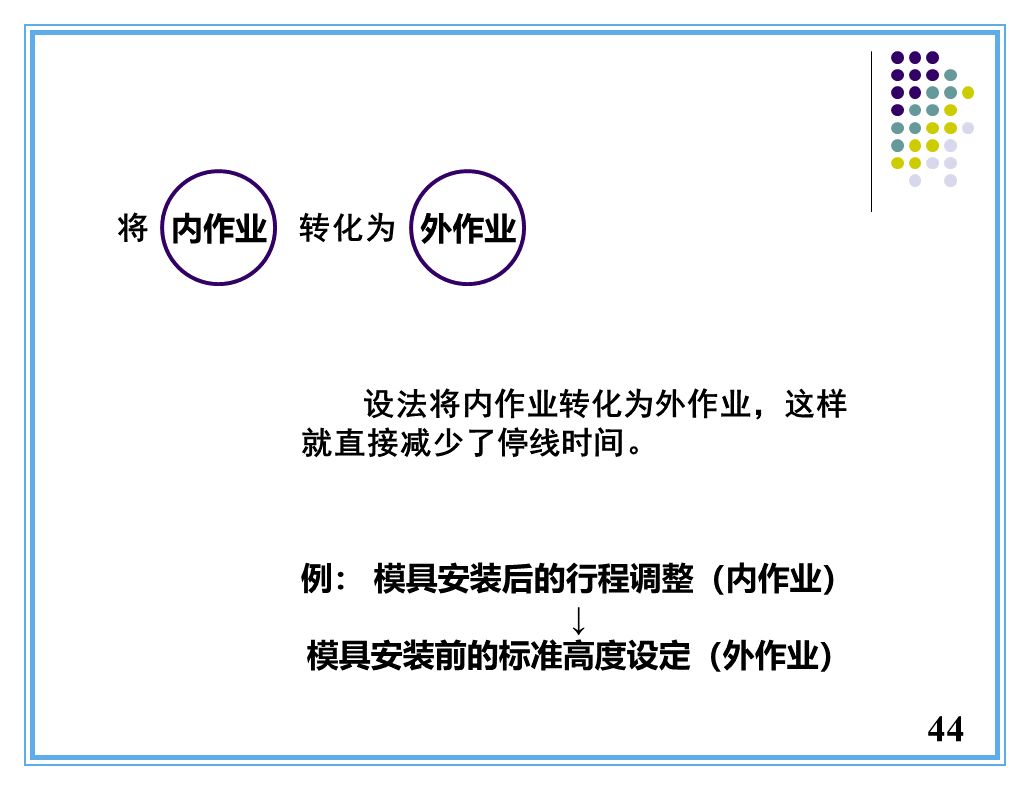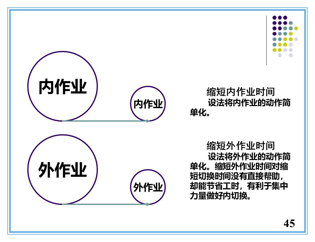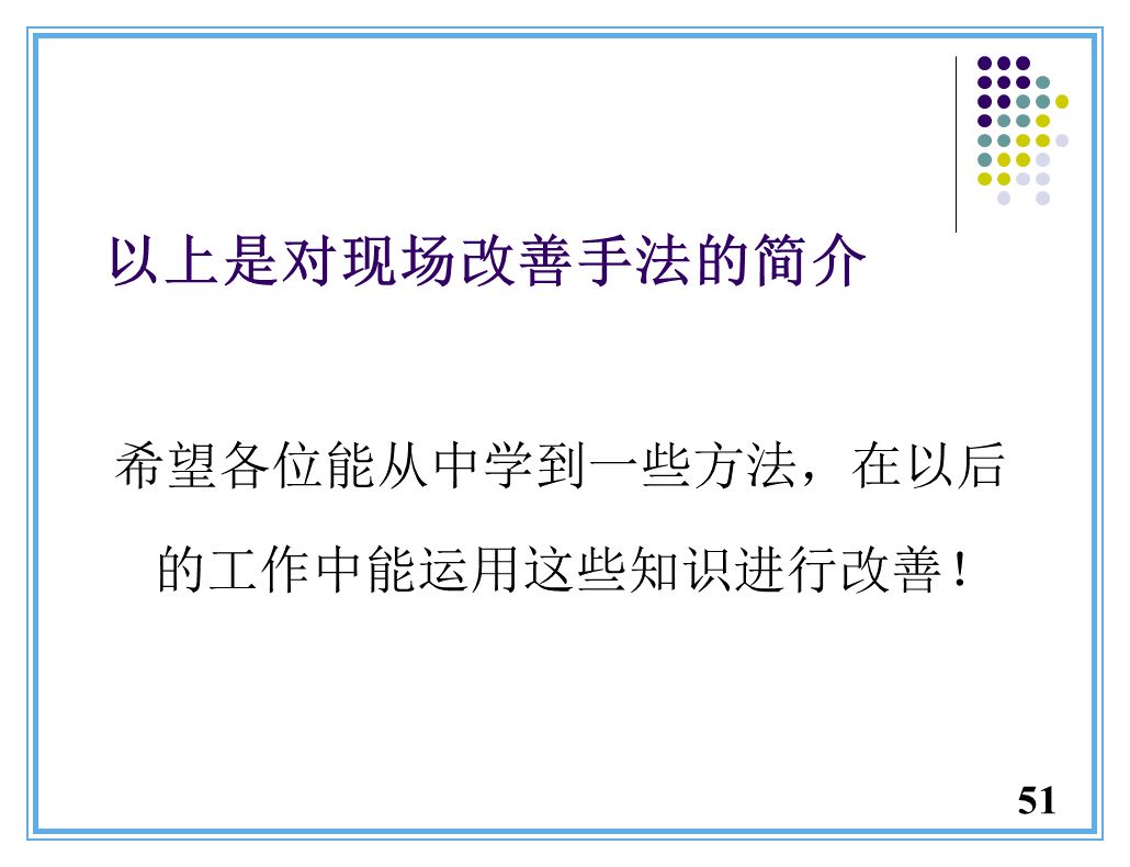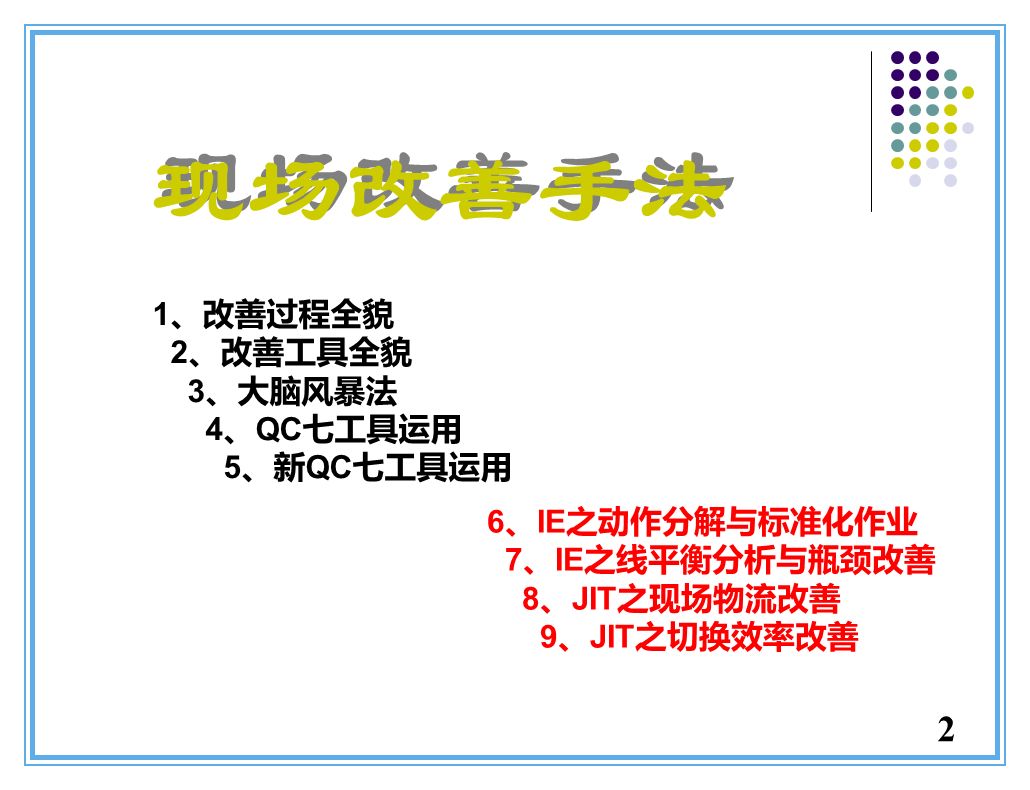 現場改善:就是對工作場所的所有要素進行改良和優化,以提高效率、質量及降低成本的活動。